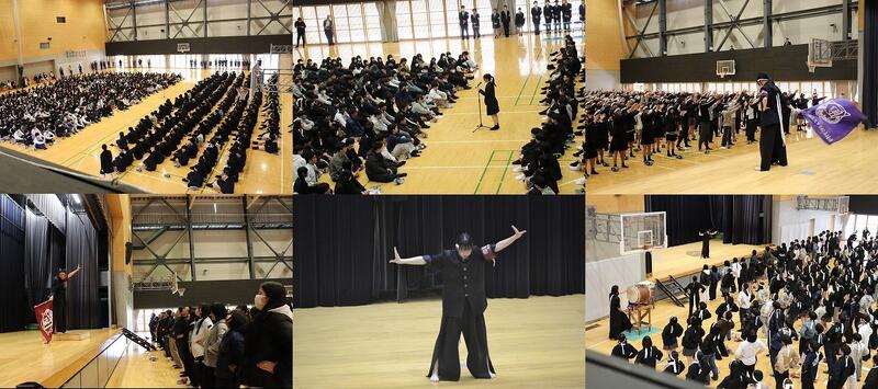 4月10日(金)の5・6校時、本校アリーナにて部活動紹介がありました。運動部・文化部・同好会を合わせた40団体に加え、生徒会と応援団からも活動が紹介されました。各団体が工夫を凝らした実演や、思わず笑いが起こるコント、華やかなダンスなどが披露されました。入学したばかりで緊張の面持ちだった1年生も、先輩たちのユーモアあふれるパフォーマンスに、楽しそうな笑顔を見せていました。