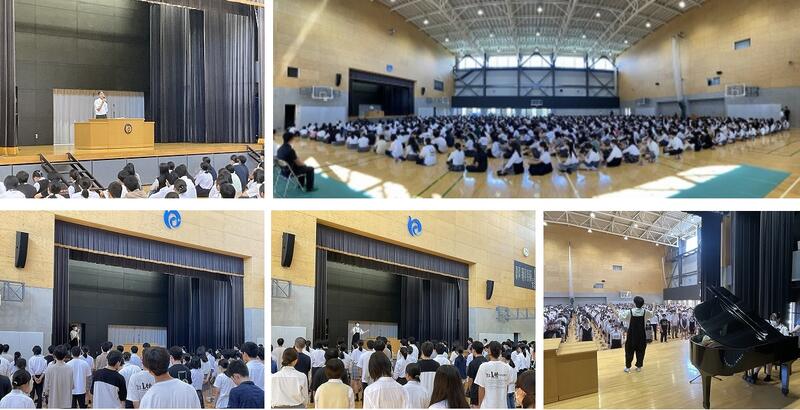 会の始めは、小野校長先生からの講話です。夏休み中、白高オープンスクールや部活動に励んだ生徒たち、全国の舞台で活躍してきた軽音楽部、筝曲部、文芸部、書道部、陸上部の生徒たちに労いと感謝の言葉があり、全校生徒で拍手を送りました。そして夏休み明けの生活について「ものごとをいつも肯定的に考え、人に対して優しい気持ちを持つことによって全員の学校生活が楽しくなるようにしていこう」というお話がありました。