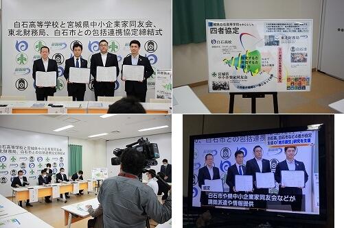 本校と宮城県中小企業同友会,東北財務局,白石市が包括連携協定を締結しました。地方創生とSDGsの推進という目標のもと,本校の総合的な探究の時間の研究活動に,講師の派遣,フィールドワークの受け入れ,イベントなどの協力をいただけるようになりました。