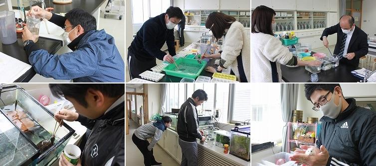 毎日9時半頃からがお世話の時間です。科学研究部生物班のN村先生だけでは3時間以上かかりますが,今日は赤ちゃんウーパールーパーのエサを準備するT沼先生,赤ちゃんを一匹ずつ個別の部屋に戻すY田先生,大人ウーパールーパーのエサやりをするY家先生と水替えをするI田先生に,亀にお箸でエサを与えるK藤先生,ハムスターのプロ,エサや水やり,掃除をするK田先生。他にも多くの先生方がお手伝いに来てくれました。明日は誰が来てくれるでしょうか。