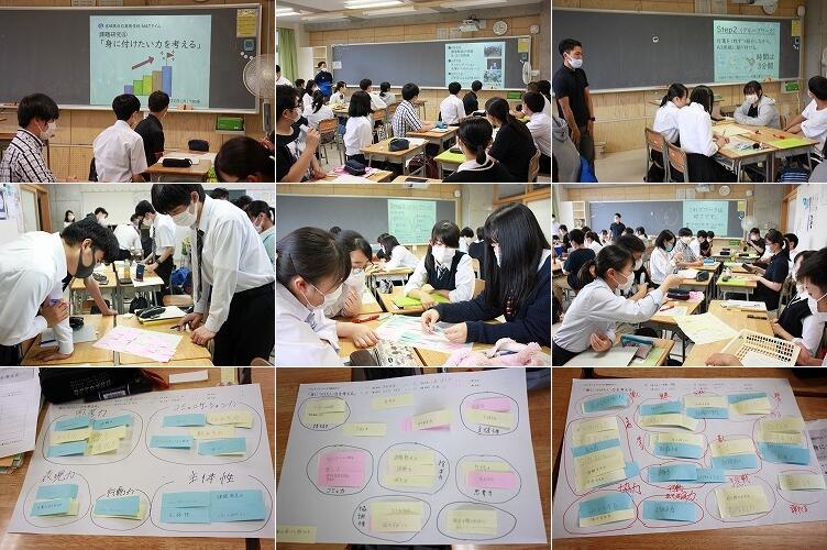今日の課題研究も1・2年生が協働で行いました。今回はこれまでの取り組みを振り返り,探究活動で身につけたい力についてブレインストーミングを行い,KJ法でまとめました。