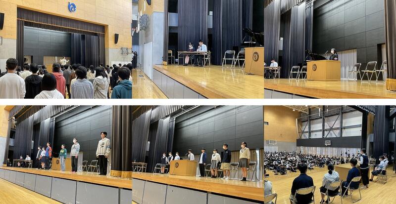 10月4日の7校時に、後期生徒総会が行われました。前期生徒総会では1年生がオンライン参加となりましたが、今回は1年生から3年生までの生徒がアリーナに集合しました。