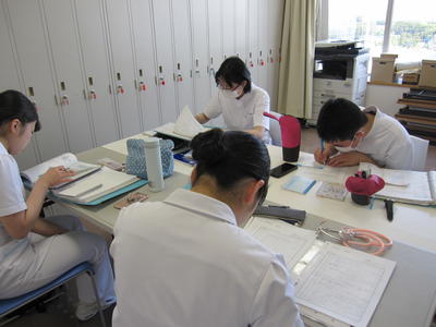 - 急性期の現場は何もかもが初めてで、ついて行くだけで精一杯でした。また患者様と接する時にもとても緊張し、何と声をかけていいのか分からず不安で一杯でした。その時先生から「あなたたちに伝えたい思いを患者様は持っているんだよ」と言われ、どうしてその思いに気づくことが出来なかったのかと、とても悔しかったです。言葉だけでない患者様の思いにいかに気づくことができるかが大切であり、常に患者様に関心を向け、患者様の変化に気づいていかなければならないと学びました。(急性期実習記録より抜粋)